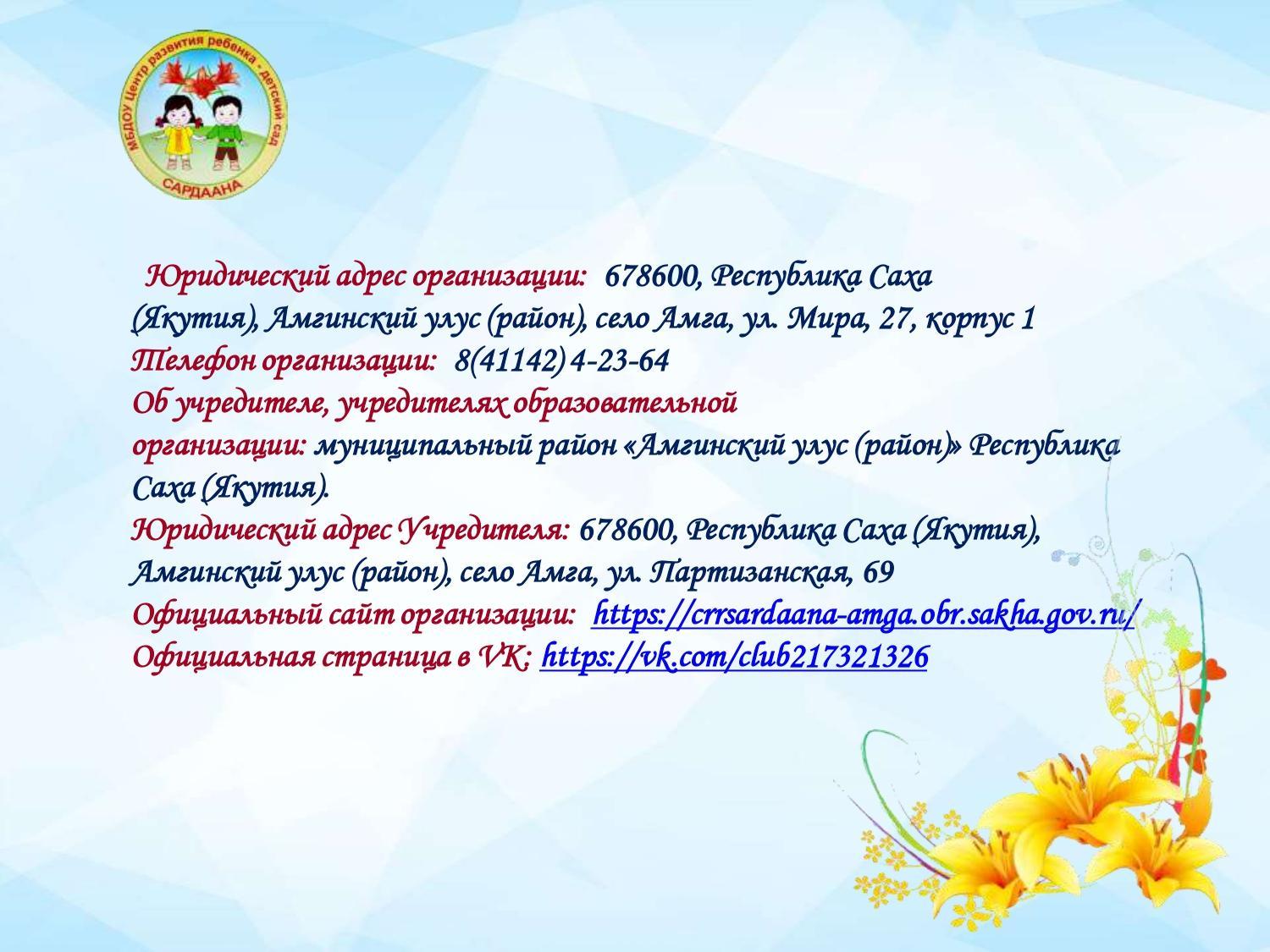 Муниципальное бюджетное дошкольное образовательное учреждение «Центр развития ребенка - детский сад "Сардаана» с. Амга